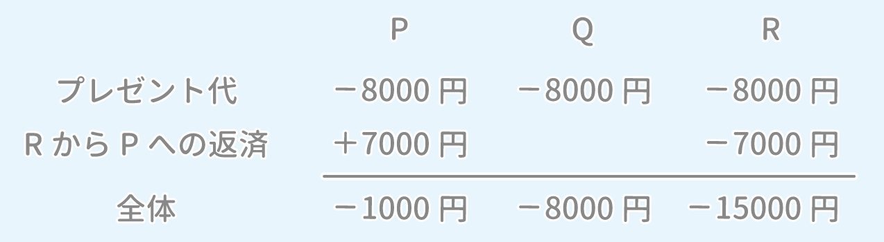 (1)この後、3人の貸し借りがすべてなくなるよう代金の精算をすることとなった。 Rは「僕はPから7000円借りていて、12000円を預けたから、差額の半分の2500円返してくれるかな」と言い、 Pは「Qからは追加で2000円もらえるかな。プレゼント代は一人あたり8000円だから、預かった額との差を考えれば、それで帳尻が合うはず」と言った。 このように精算するとPはいくら得、または損をするか。