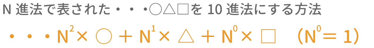 以上のことから、N進法で表現された数を10進法に変換するためには、下記の公式を使えばよいと分かります。