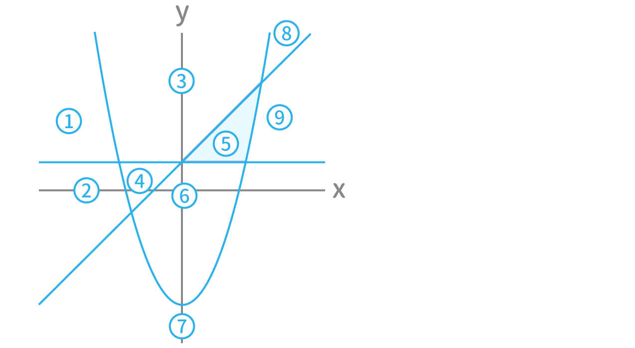次の3つの式によって表される直線と放物線は、図のように平面を9つの領域に分ける。