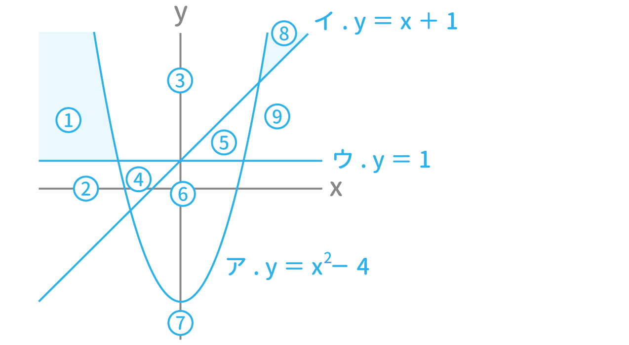 • (1)ア、イ、ウの式の等号を、全て不等号に置き換えて、⑤の領域を表すとき、左開きの不等号(>)がつくのは、ア、イ、ウのうちどれか。